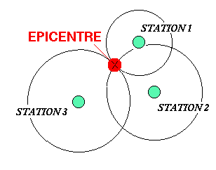 Sur la carte il suffit ensuite de tracer trois cercles ayant comme centre la station et comme rayon la distance épicentre station; ils se recoupent au niveau de l'épicentre.